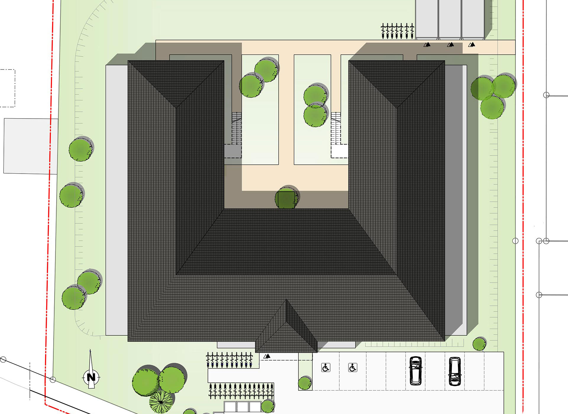 Das Erdgeschoss wird aus zwei Wohngruppen mit jeweils 12-Mikro-Apartments bestehen, die durch die Diakonie Stiftung Salem gGmbH betreut werden.